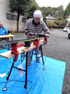 今年は少し遅れて11月1日~2日に清川村のコテージ「花の木」にて行いました。昨日の夜は大雨で朝はどうか心配しましたが、快晴といかないまでも雨の心配は全くありませんでした。スキーの作業台は自作物から、念願の市販のものを購入、スキー専用のものと変わらないのに値段は半分‼ ずいぶんと探したのに見つからずあきらめていたところ、スキー仲間から「左官台」で検索したらといわれ、検索したところ見事にヒット。ラダーステップでもよかったようです。「作業台」ではあきませんでした。(>_<)