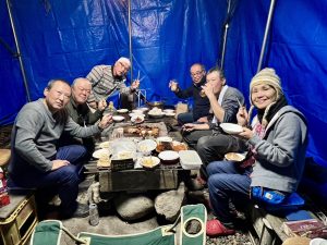夕食はホテルのビュッフェ。皆さんトレーには沢山の料理を盛って、今日もカンパーイ!!