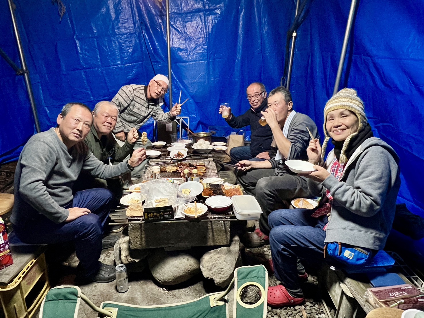チューナップ終了後はバーべキュウのセッティング。屋根付きバーべキュウの骨組みにブルーシートを巻き付け防寒対策。囲炉裏に炭を投入し、順次風呂に。労働した後の風呂上がりのいっぱいは、こたえられませんね~。スキー場から帰って風呂上がりのいっぱいと同じぐらい美味しいです。